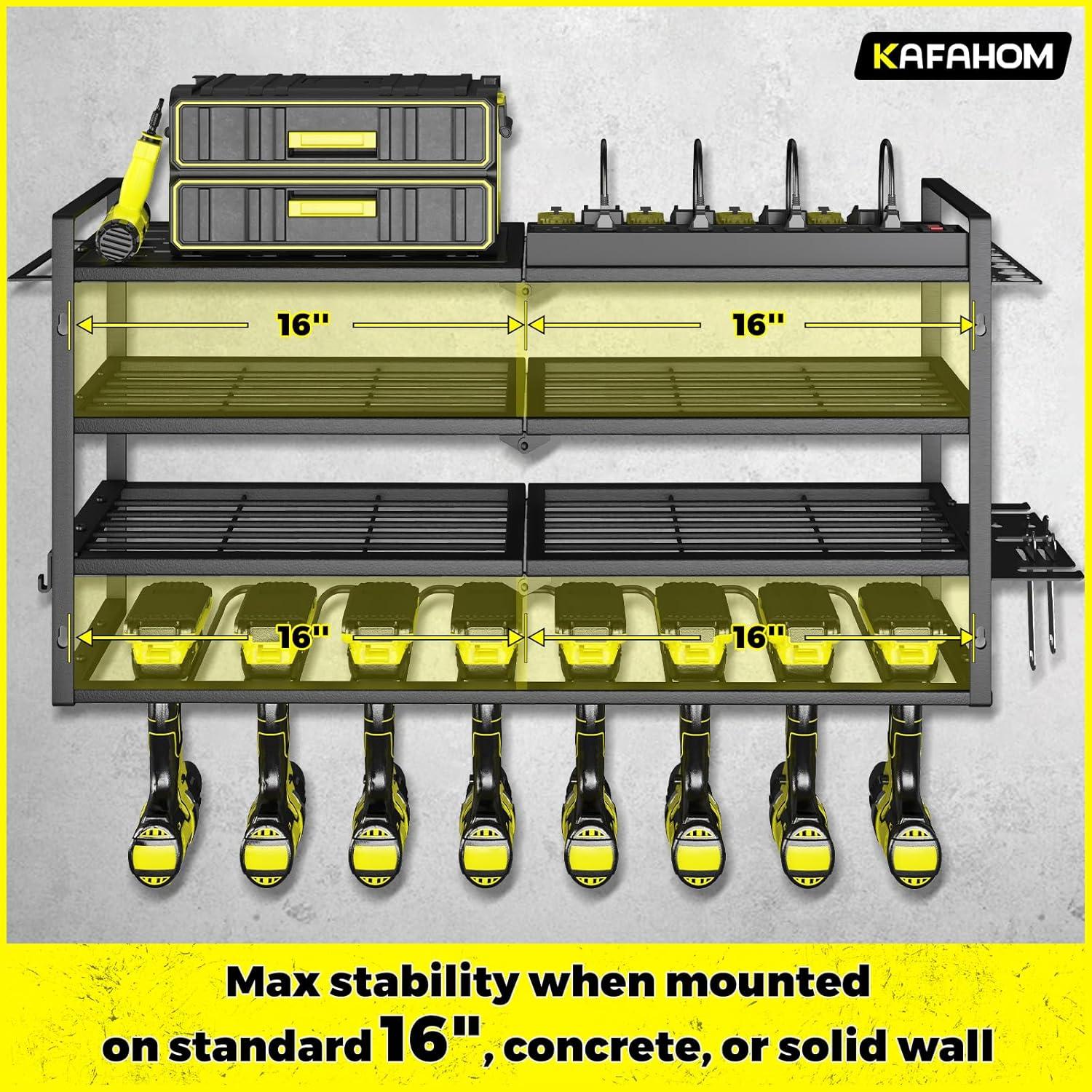 Widen Space: Upgrade your workspace organization with the KAFAHOM Extended power tool organizer wall mount with charging station, featuring a widened design and three spacious tiers. Two upper tiers offer versatile storage for power tool accessories and workshop essentials. In contrast, the bottom tier provides eight universal power tool slots, ensuring effortless organization for all your tools.