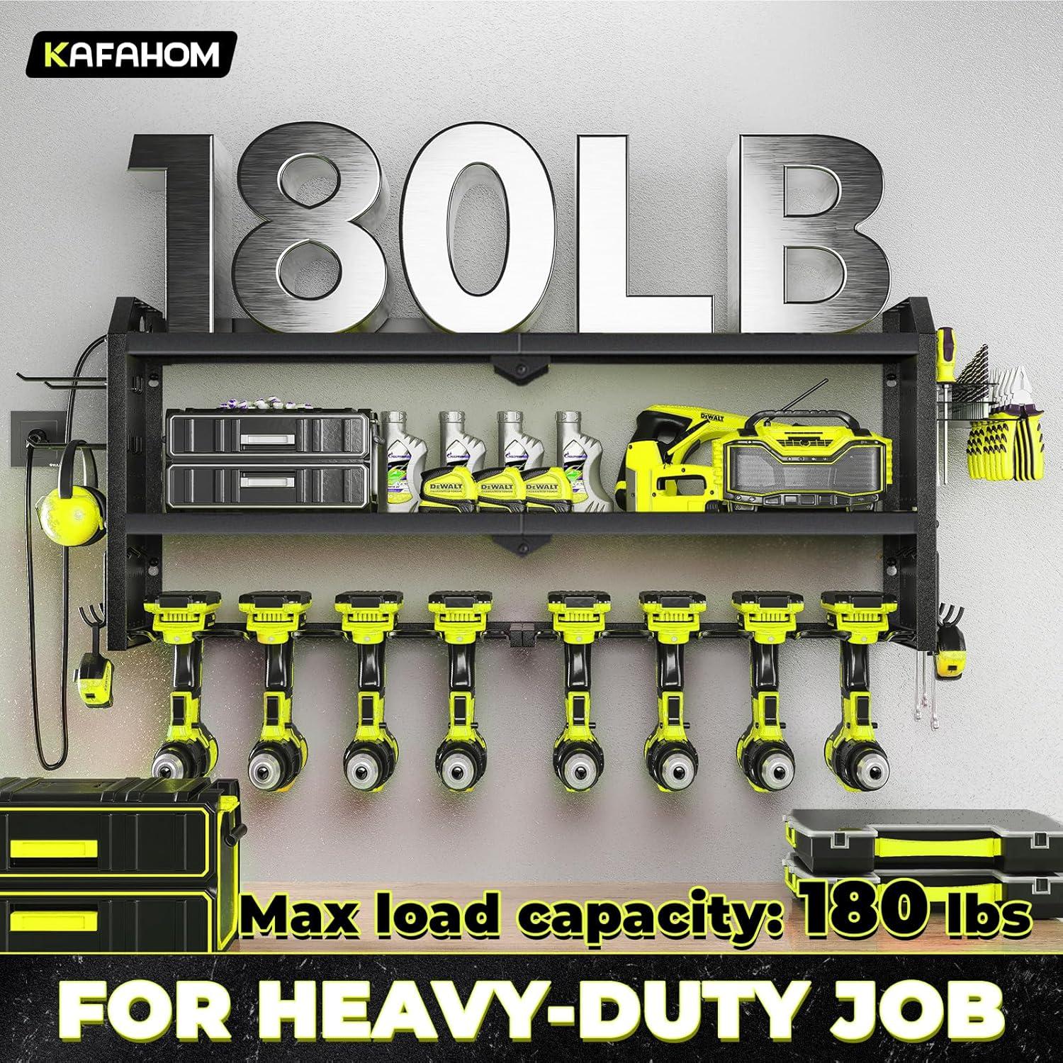 Robust Construction: Built to last, KAFAHOM tool box organizers and storage wall mount features a sturdy alloy frame and reinforced double-layered metal plates for exceptional load-bearing capacity. It's the ideal utility cordless drill holder for a wide range of tools and accessories.