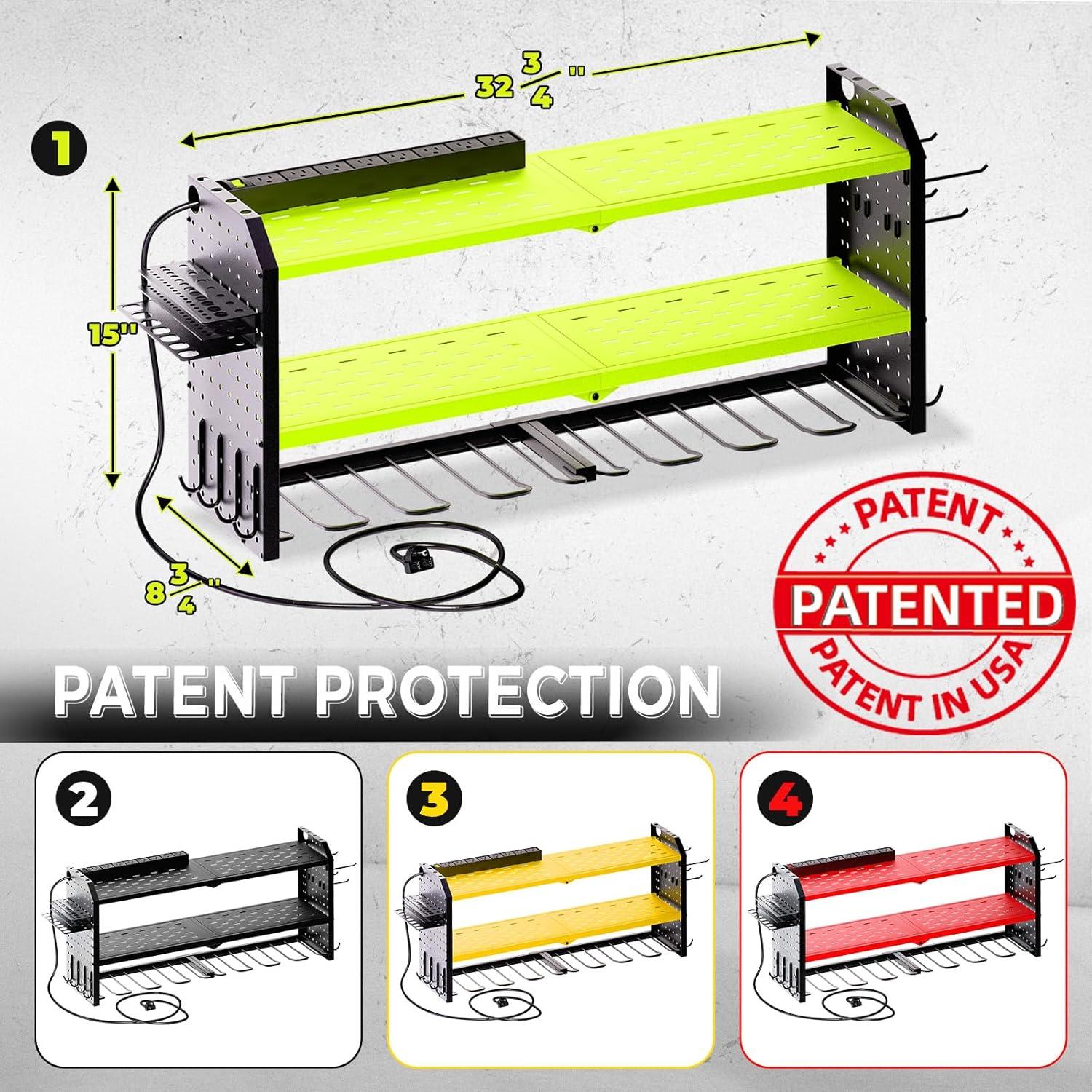 KAFAHOM Power Tool Organizer with Charging Station, Built in 8 Outlet Power Strip,Large 8 Drill Holder Wall Mount, Heavy Duty Metal Power Tool Storage Rack Tool Shelf for Garage Organization Black(Green-32 inches)