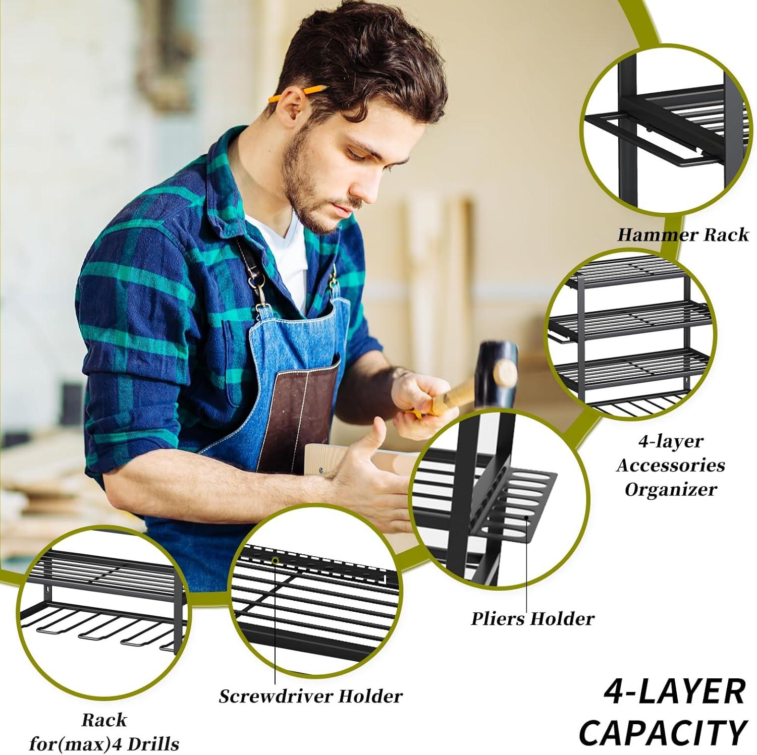 HIGH CAPACITY: The KAFAHOM power tool organizer has 2 downside racks that can hang up to 8 power tools – 20Vs, 60Vs, and 66Vs. Plus 4 extra upper layers for accessories of those power tools like battery holders, batteries, drill bits, rotary tools, nail units, etc. The tool organization and storage also comes with 9 holes for screwdriver storage ,7 for pliers. The entire body is made of cold-rolled carbon steel for excellent durability and a load capacity of over 180 lbs (max).